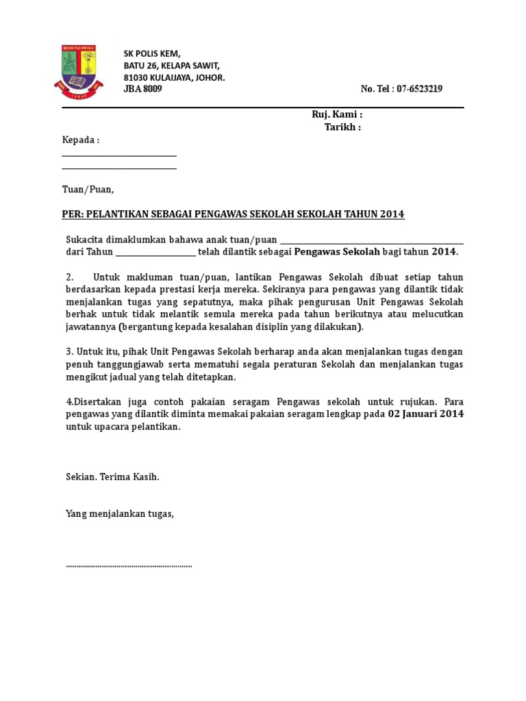 Contoh surat tidak datang ke sekolah 1 hasnita binti abdul malek no222 jln serindit 8 taman indah 82000 pontian tuan guru. Contoh Surat Makluman Menjadi Pengawas By Tia_55Lucian 28 Jun. Contoh surat tugas dari kepala sekolah yang ditujukan kepada Guru Staf maupun Karyawan Sekolah merupakan surat perjalanan dinas.